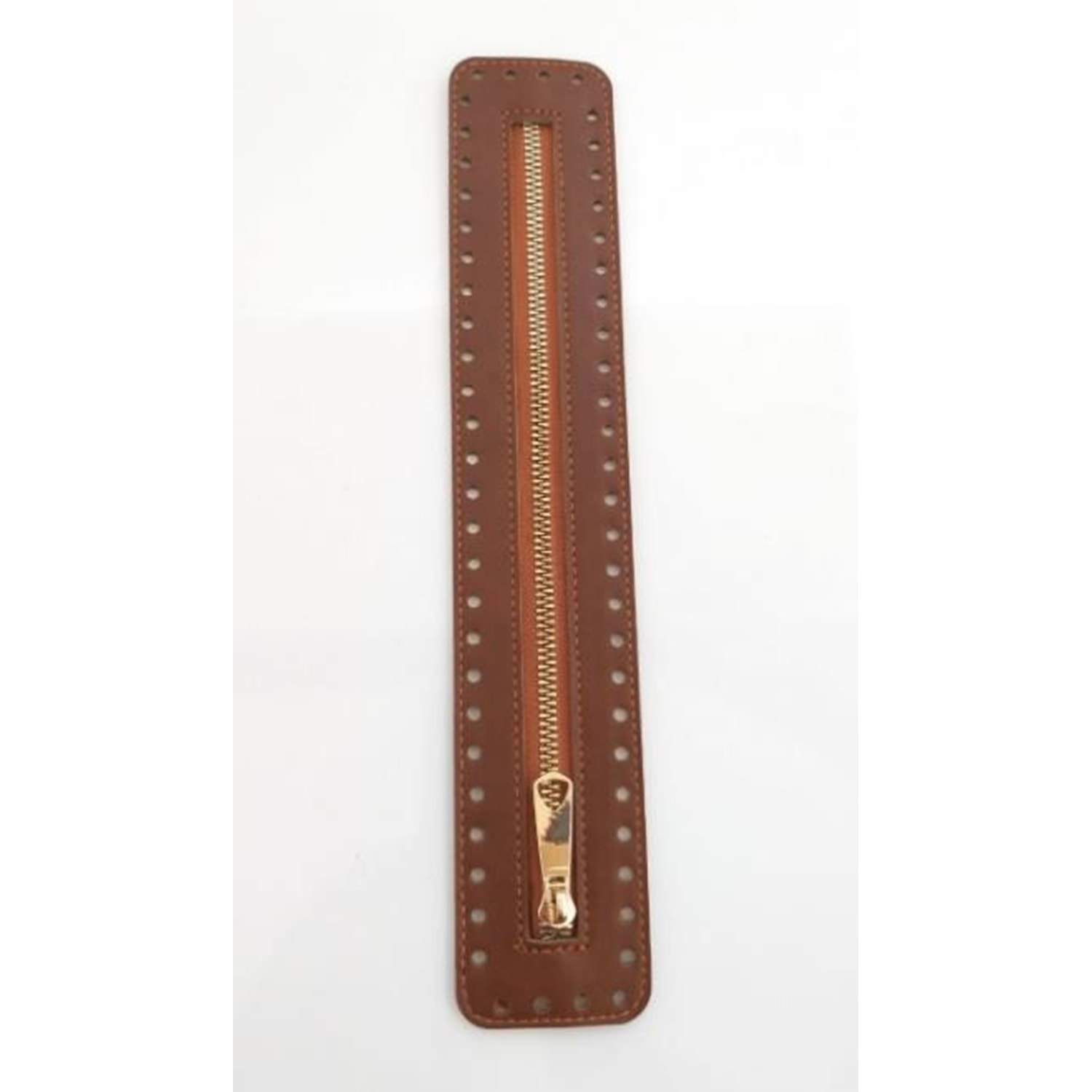 Suni deri kullanılmıştır. Ebatları 30X5.5 cm'dir. Renk ve Metal seçenekleri ayrı ayrı yüklenmiştir. Kenarlarındaki delikler tığ ile monte etmek için tasarlanmıştır. Dikerek de montaj yapılabilir. Örgünün kendi ipi ile montajı yapılabilir. Tek olarak gönderilir.