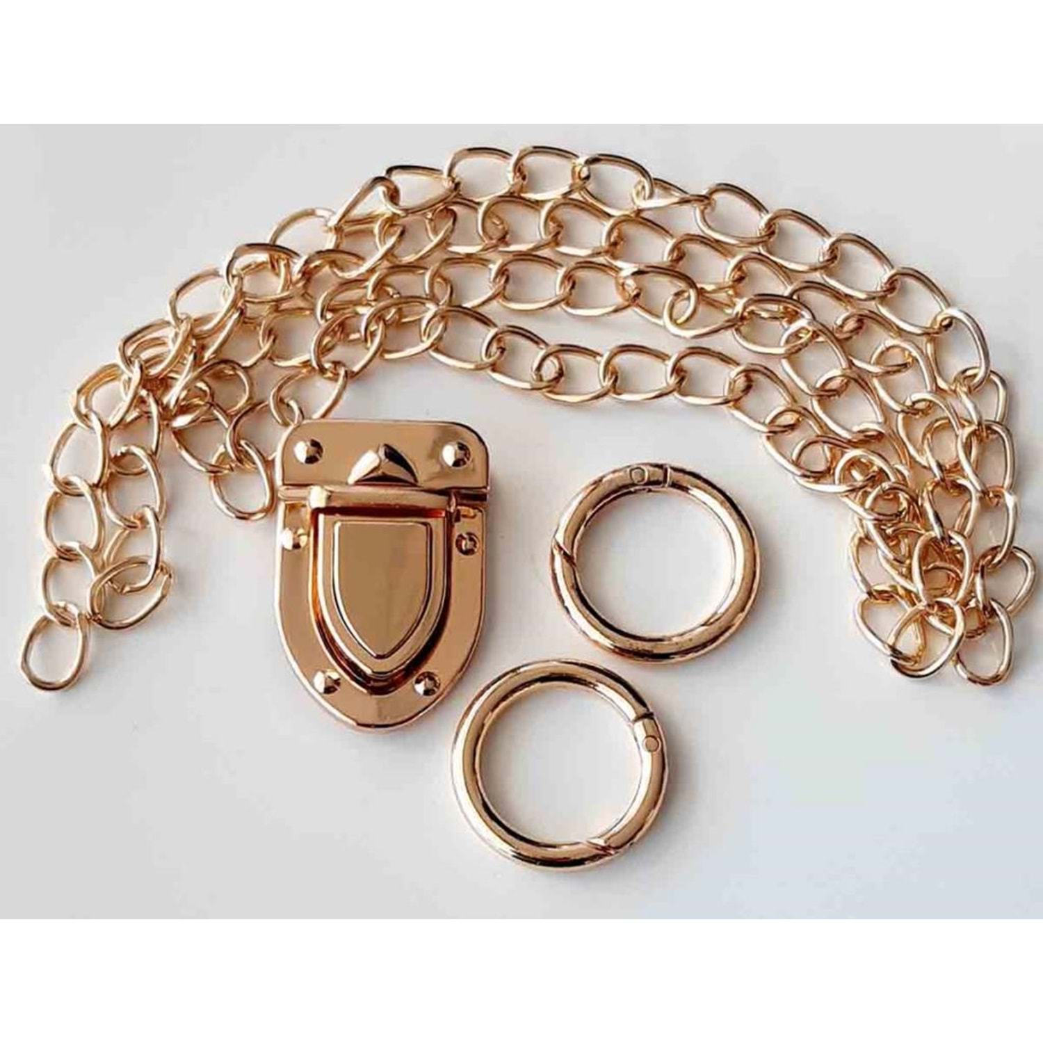 Zincir 1 metredir. Fıstık Çanta seti olarak bilinmektedir. 2 adet halka gönderilecektir. Halkalar yaylıdır. Kilit arkası kancalıdır.