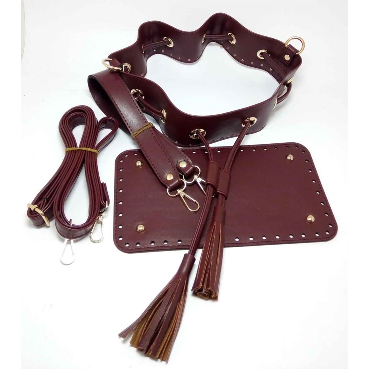 Metal aparatları light gold olarak mevcuttur.Büzgülü kısmın çapı 24 cm civarındadır. Kısa sap 42x2.5 cm, Uzun sap 120x2 cm ayarlanabilir.Taban 25x14 cm dir. Deri ürünler tarafımızdan üretilmektedir.