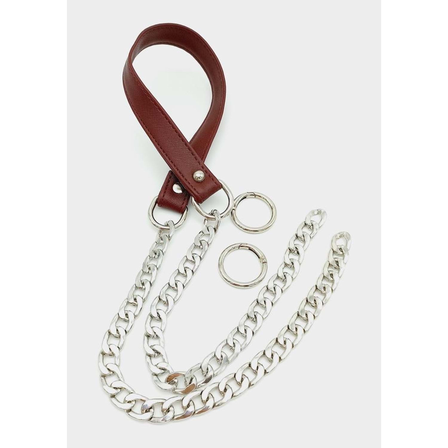 Çanta Aksesuar Suni Deri Dikişli Gümüş Zincirli Bordo Renk Çanta Sapı