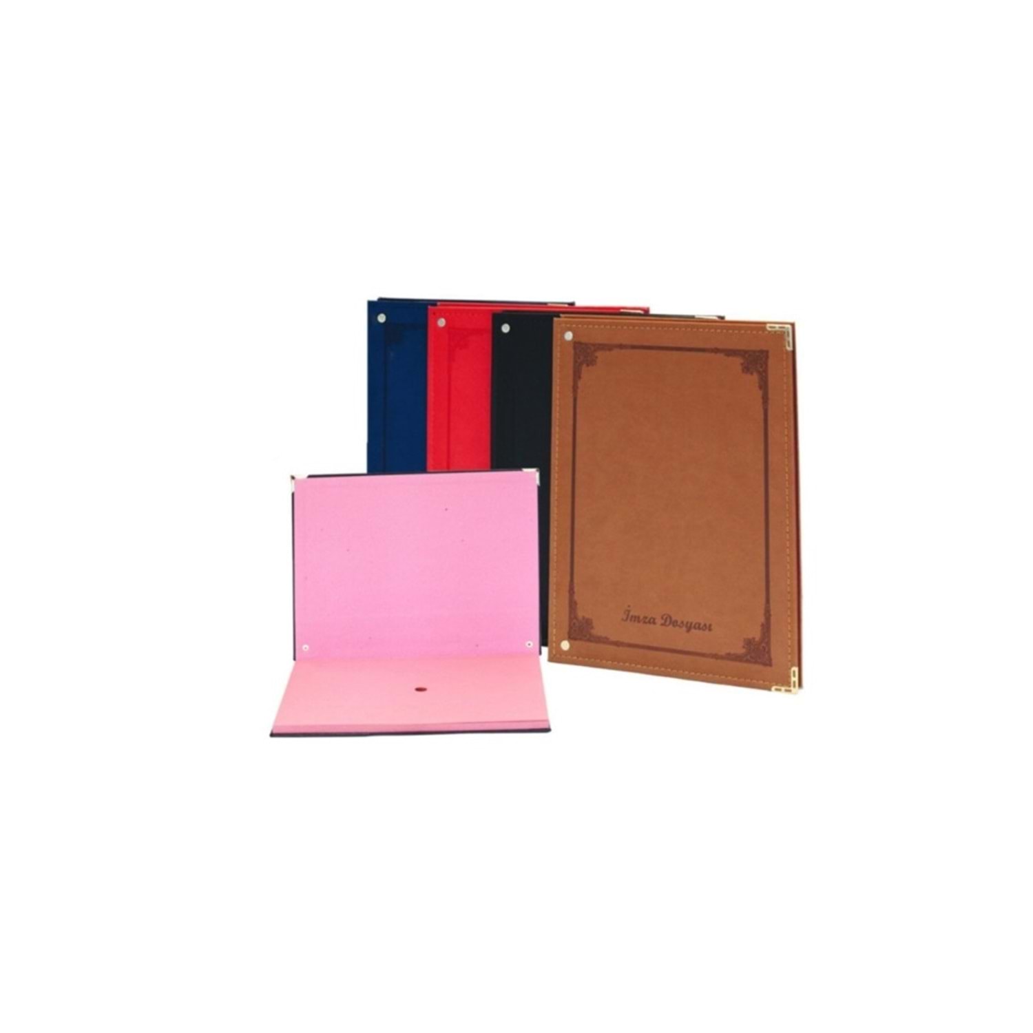 24'lü dosya metal köşelik ve perçin termo deri iplik dikişli kapak üzerine özel gofre baskı yapraklar pembe karton sünger takviyeli 2 mm mukavva 24 yaprak