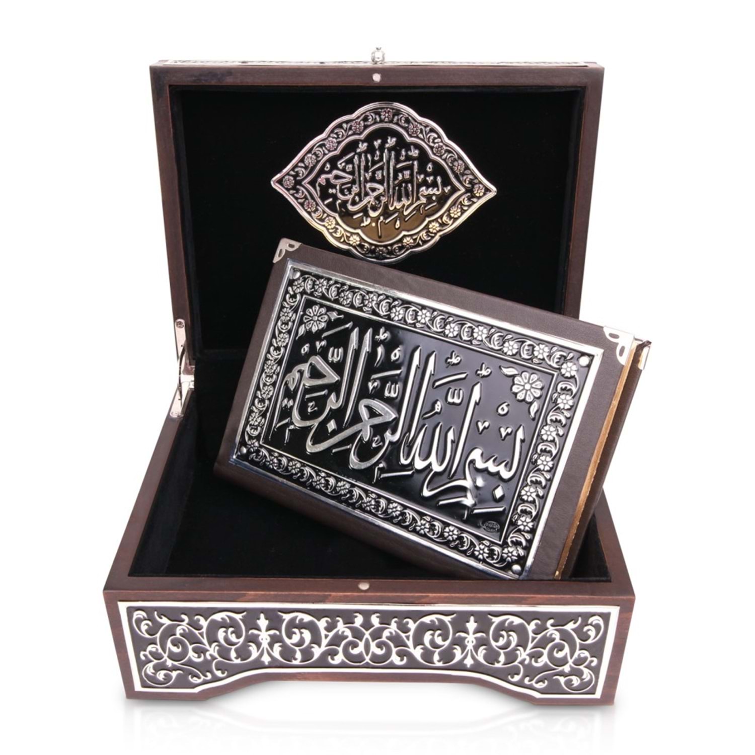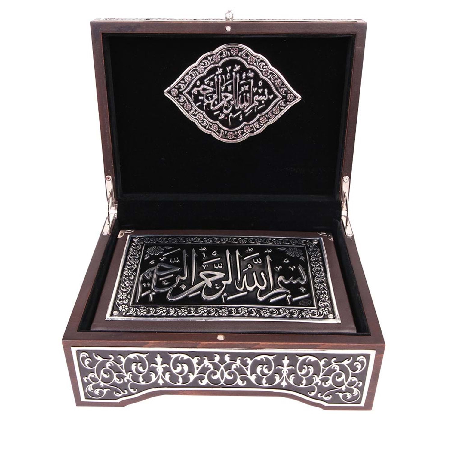 *Kuran-ı Kerim 925 Ayar Gümüş Kaplama *Kutu Gümüş Metal Kaplama *Kapak Rahleli *Baskı: Süblimasyon Metal