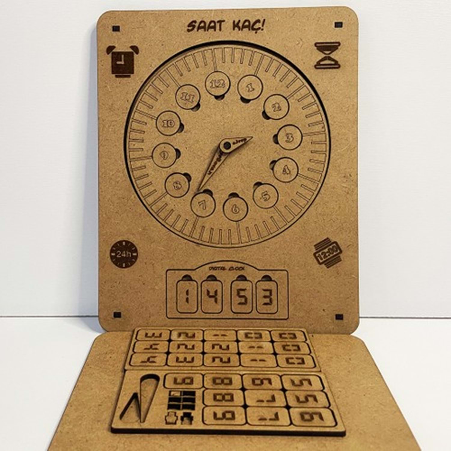 Montesori eğitimine uygun saat gösteren ahşap oyuncak zeka geliştirici sağlıklı ISO belgeli boyanabilir 20*20 cm boyutunda