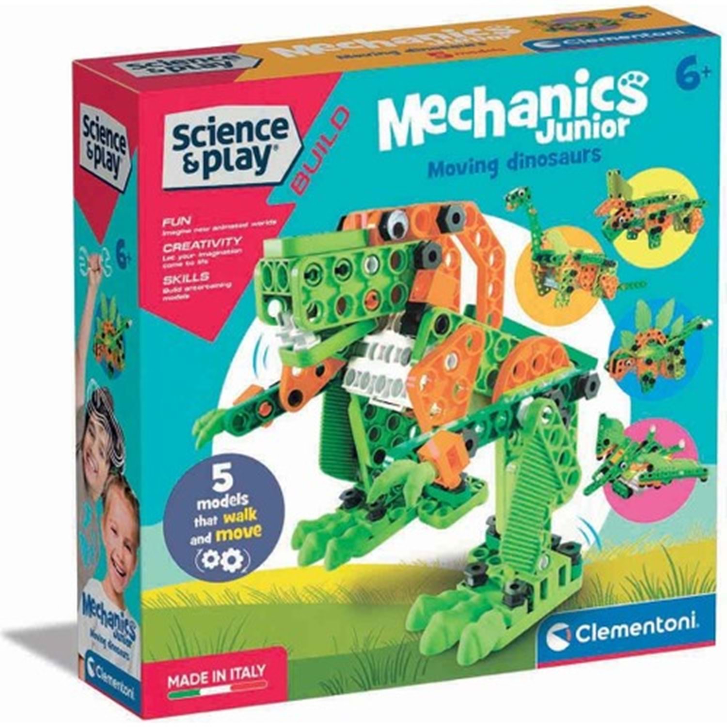 Zengin görsellere sahip bilimsel kullanım kılavuzu sayesinde çocuklar; T-Rex, Brontosaurus, Stegosaurus, Triceratops ve Pterodactyl olmak üzere 5 motorlu dinozor modeli oluşturabilecekler.