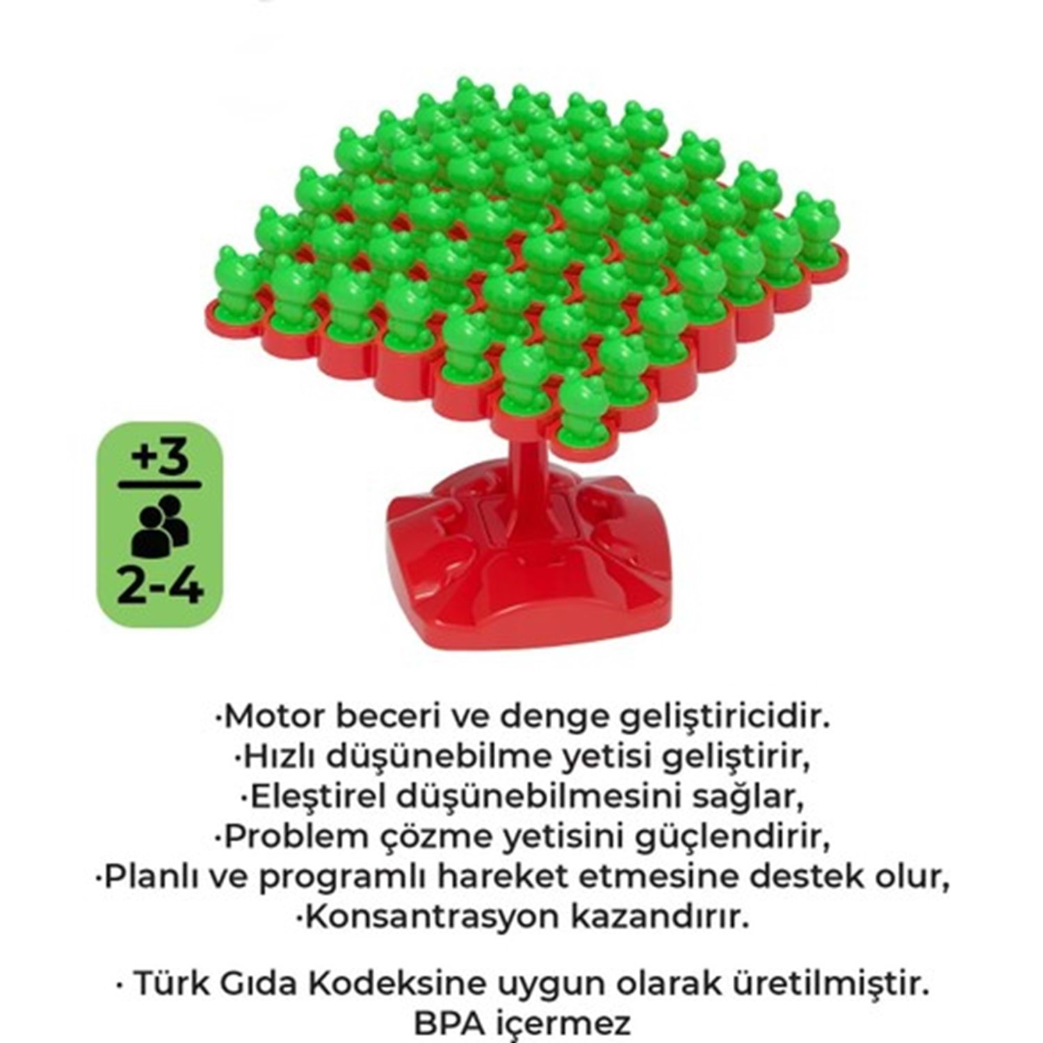 Kurbağa Denge Oyunu - Frog Balance Kutu Oyunu Eğitici Oyun Beceri Oyunu Oyun Seti Montessori Oyuncak Nasıl Oynanır ? Denge platformu çubuğun üzerine takılır. Her oyuncu sırası gelince zar atar ve zarda gelen sayı kadar kurbağayı platformun dengesini bozmadan yerleştirmeye çalışır. Ama dikkat et dengeyi bozan oyunu kaybeder. •Motor beceri ve denge geliştiricidir. •Hızlı düşünebilme yetisi geliştirir, Eleştirel düşünebilmesini sağlar, •ProbIem çözme yetisini güçlendirir, •PIanIı ve programlı hareket etmesine destek olur ve konsantrasyon kazandırır. • Türk Gıda Kodeksine uygun olarak üretilmiştir. * BPA içermez