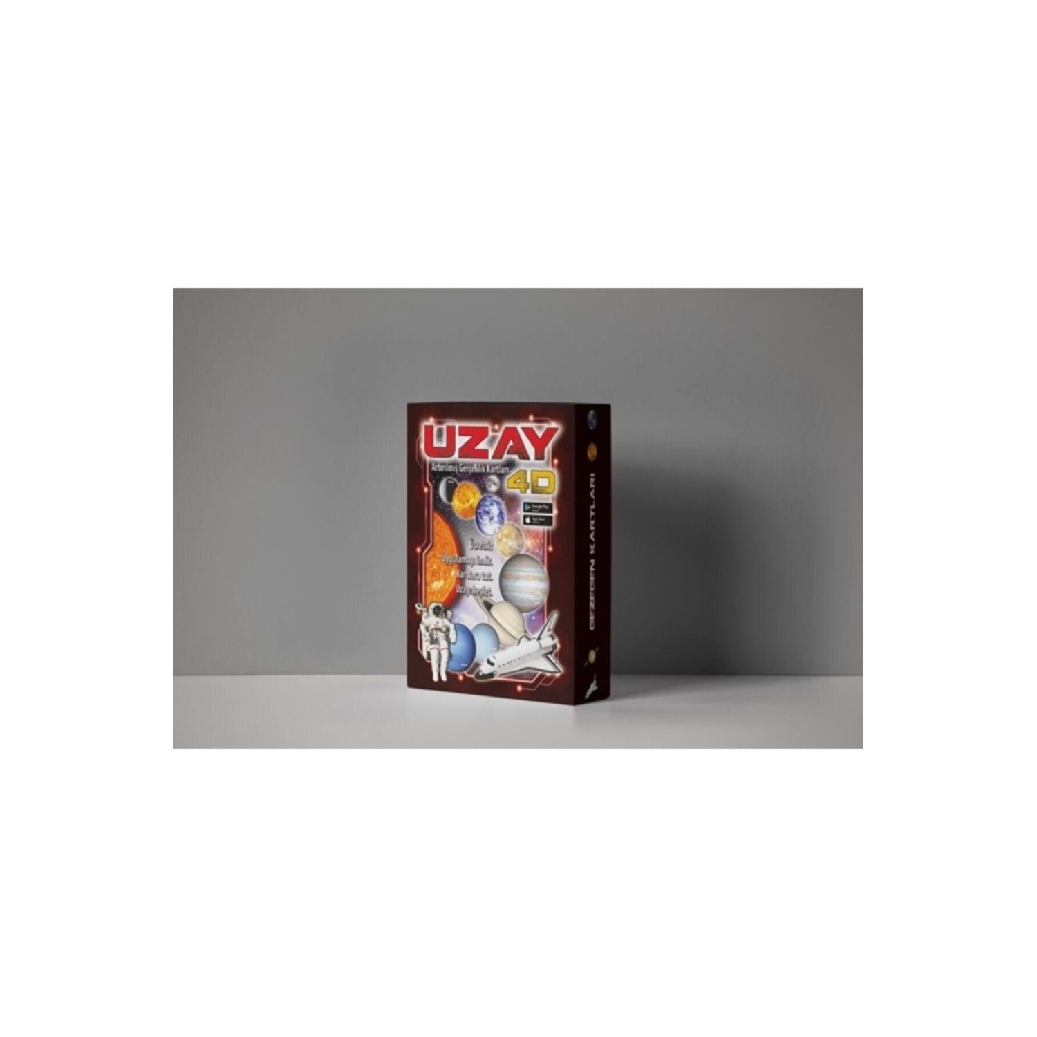 Uzay 4D Artırılmış Gerçeklik Kartları Uzay kartları ile evrende bir yolculuğa çıkalım. Uzayı, Güneş sistemini ve uzay araçlarını yakından inceleyelim. Uzay hakkında merak ettiğimiz bilgileri, 3 boyutlu modelleri inceleyerek öğrenelim. 20 farklı uzay kartını UZAY 4D uygulaması ile 4 boyutlu olarak incele. Akıllı cihazını kullanarak, Artırılmış gerçeklik içerikli ve sanal ortam destekli bu harika kartlarla; uzay, gezegenler ve uzay araçlarını yakından gözlemyelebilirsiniz. Üç boyutlu gerçekli animasyonlarla uzay ve gezegenler hakkında bilinmeyenleri keşfedebilirsiniz.