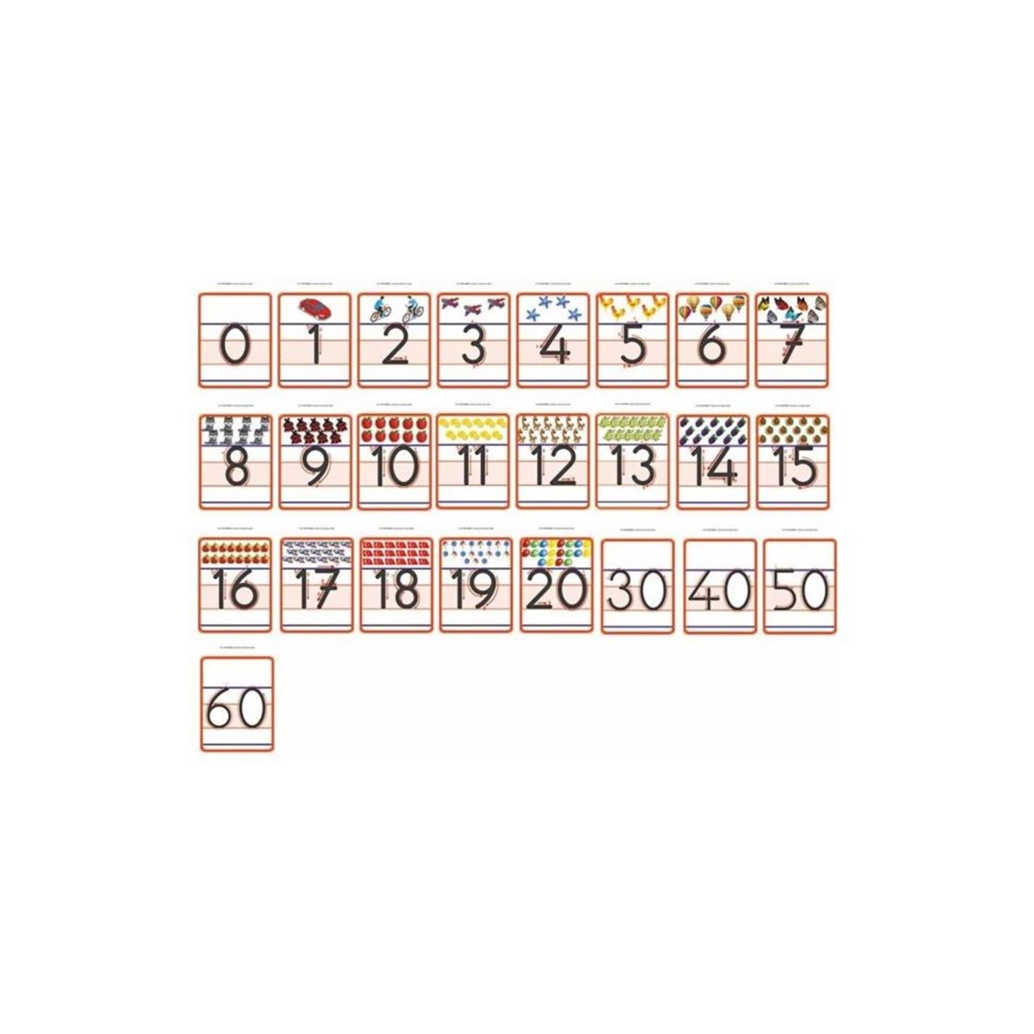 Dik ve temel harfler ile sayıların öğretilmesinde, doğru yazım tekniğinin pekiştirilmesinde öğretici olarak kullanılabilir. Kartların ölçüleri 16x23 cm ebatlarındadır ve sert kartondan imal edilmiştir. Toplamda 25 adet sayılar kartı yer almaktadır. Ayrıca panoya ip üzerine asılması için kıvrımı da mevcuttur. Kartlar Milli Eğitim Bakanlığı' nın yeni müfredatına göre hazırlanmış ve onaylanmıştır.
